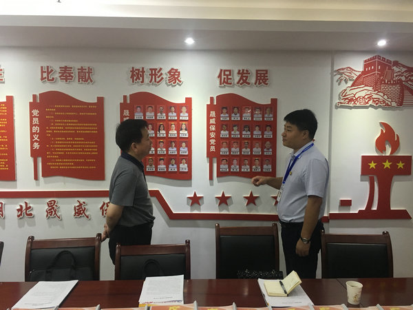 7月9日上午,武漢市工商聯(lián)副主席楊松民帶領(lǐng)武漢市工商聯(lián)會員部部長閔勝華、武漢市工商聯(lián)會員部副調(diào)研員劉玉瓊、武漢市工商聯(lián)辦公室主任科員殷莎、宜昌市人民政府駐武漢辦事處科長陶紅艷、武漢宜昌商會秘書長高愛民一行,輕車簡從,冒雨赴湖北晟威保安公司考察黨建工作,為企業(yè)現(xiàn)場解決發(fā)展中的問題,踐行“不忘初心 牢記使命”要求。在考察交流中,通過實地查看黨員活動室和黨建資料臺賬,詳細了解黨建工作開展情況,并走訪查看滕倉烽火項目點黨員示范崗創(chuàng)建情況。