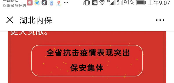 湖北晟威保安公司被省公安廳內(nèi)??傟?duì)授予全省抗擊疫情表現(xiàn)突出保安集體