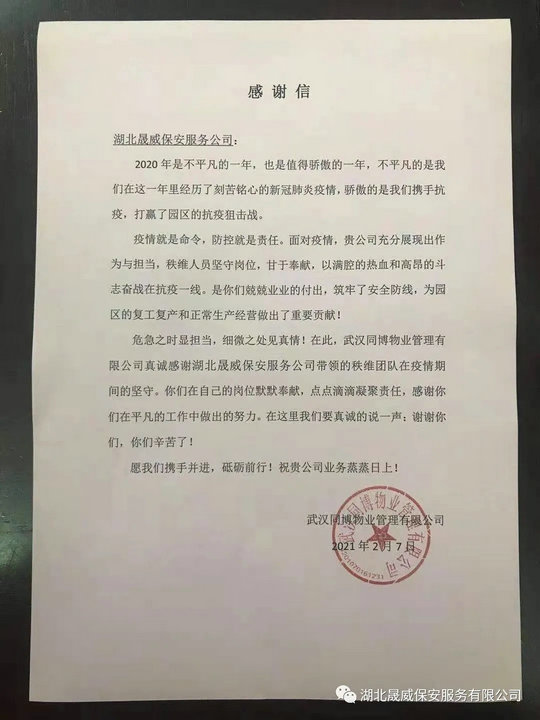 2月7日,湖北晟威集團旗下湖北晟威保安公司辦公室,收到一封客戶感謝信,該信系客戶單位武漢同博物業(yè)管理有限公司來函。信中對湖北晟威公司派駐烽火通信各廠區(qū)保安日常工作給予了高度肯定,感謝晟威保安的堅守付出。此信進一步增強了駐守同博物業(yè)服務(wù)項目點保安員的工作熱情。
