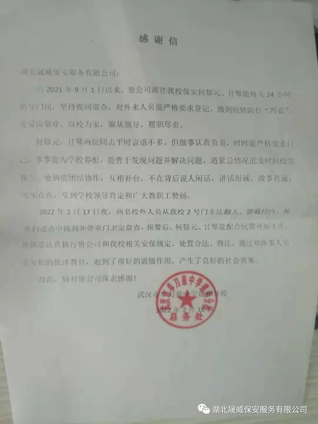 【風(fēng)采展示】 晟威保安履職盡責(zé)受到客戶書面表揚