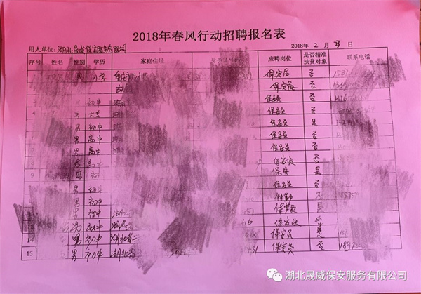 公司發(fā)展不忘貧困的父老鄉(xiāng)親,每年為全省貧困地區(qū)精準(zhǔn)扶貧特困家庭提供就業(yè)崗位上百個(gè),累計(jì)達(dá)1000人次,帶動(dòng)貧困家庭脫貧致富,為湖北實(shí)施精準(zhǔn)扶貧精準(zhǔn)脫貧方略提供了有效路徑和方式,為構(gòu)建幸福湖北履行了企業(yè)的社會(huì)責(zé)任。湖北晟威2018年度招聘活動(dòng)正火熱進(jìn)行中。公司每年在全國(guó)各地貧困地區(qū)展開(kāi)招聘,為精準(zhǔn)扶貧對(duì)象提供就業(yè)崗位,參加政府舉辦的多場(chǎng)招聘活動(dòng),此次受邀參與了興山縣2018“春風(fēng)行動(dòng)”大型專場(chǎng)招聘會(huì),旨在促進(jìn)轉(zhuǎn)移就業(yè)、支持返鄉(xiāng)創(chuàng)業(yè)、助力增收脫貧。本次活動(dòng)規(guī)模大、人數(shù)多,現(xiàn)場(chǎng)氛圍異常火爆,湖北晟威以專業(yè)的企業(yè)形象和業(yè)界的優(yōu)秀口碑,特別是公司規(guī)范化的管理以及優(yōu)勝劣汰的晉升機(jī)制,吸引了許多有抱負(fù)、有目標(biāo)的年輕人的目光。活動(dòng)現(xiàn)場(chǎng),求職者滿腔熱情,我們的招聘人員及人事經(jīng)理也是耐心的解答他們的疑問(wèn),并向他們?cè)敿?xì)介紹了公司的概況及以后的發(fā)展空間。期間,現(xiàn)場(chǎng)負(fù)責(zé)人向大家分享了自己的經(jīng)歷,自己是如何從一名普通的保安員一步步腳踏實(shí)地,晉升到保安隊(duì)長(zhǎng),現(xiàn)在已經(jīng)擔(dān)任項(xiàng)目經(jīng)理一職,湖北晟威愿意給每一個(gè)心懷理想的人一個(gè)平臺(tái),站在晟威的肩膀上,插上翅膀,勇敢去闖!
