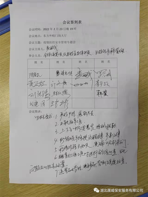 2月23日晚上,湖北晟威保安咸寧分公司在咸寧東方外國語學校,召開疫情防控工作緊急會議,傳達最新的疫情防控情況。東方外校韓冀校長、羅會明副校長、保衛(wèi)科李主任、駐校全體保安隊員及老校區(qū)保安隊員參加了會議。會上分公司總經(jīng)理李西成首先通報了武漢最新發(fā)現(xiàn)的新冠病毒疫情陽性人員情況。2022年2月21日下午,3名外地來漢人員及1名密接者新冠病毒核酸檢測結(jié)果為陽性。武漢市疫情防控指揮部立即啟動應急響應機制,全面開展流行病學調(diào)查、相關人員排查、采樣檢測和隔離管控,落實相關場所及環(huán)境終末消毒等防疫措施。