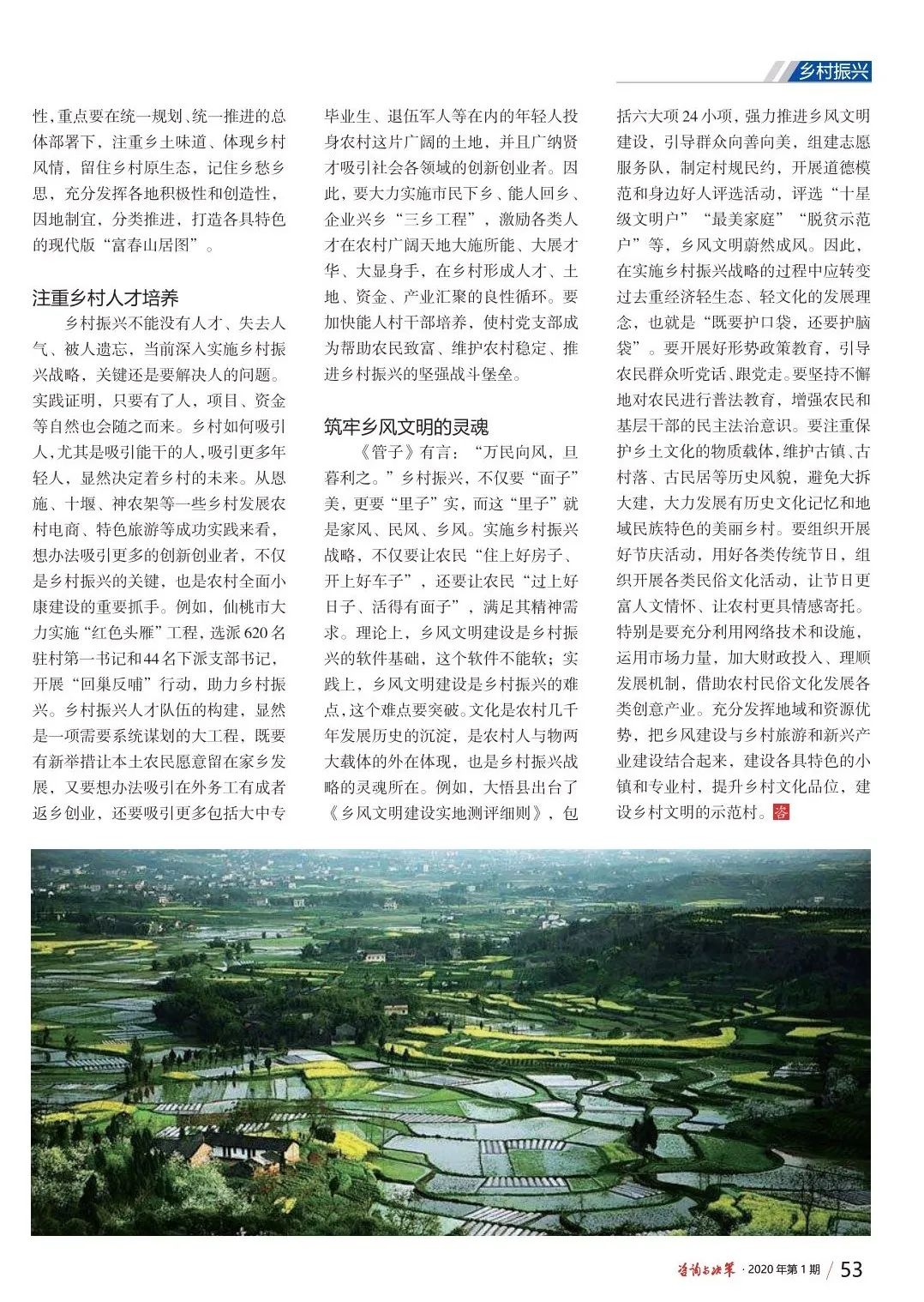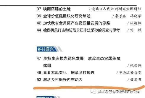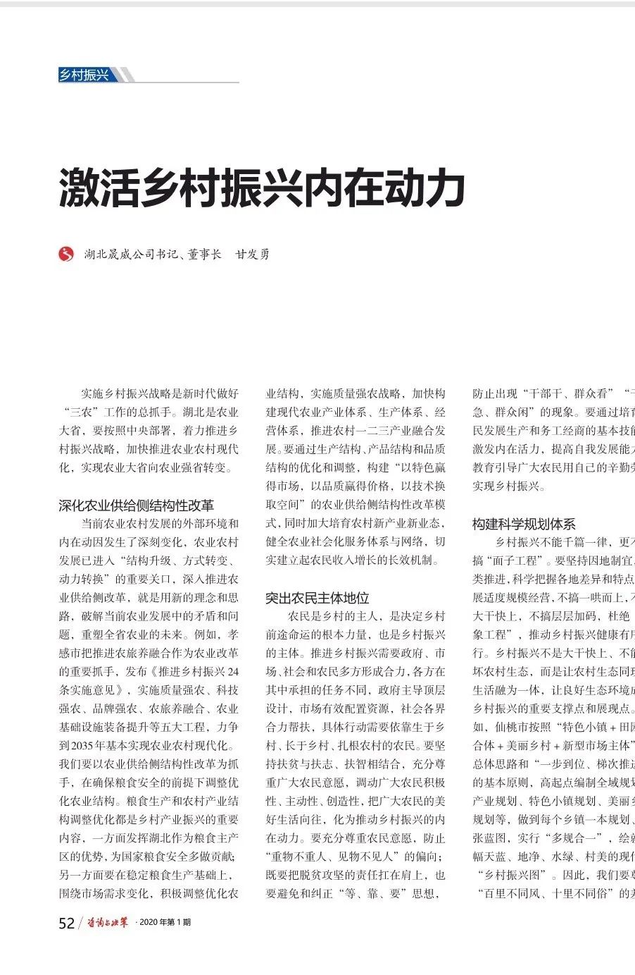 2020年湖北咨詢與決策》雜志總第379期,在“鄉(xiāng)村振興”欄目以《激活鄉(xiāng)村振興內(nèi)在動(dòng)力》為題,登載了湖北晟威公司黨總支書記、董事長(zhǎng)甘發(fā)勇的調(diào)研文章。文章共分五個(gè)部分,即:一、深化農(nóng)業(yè)供給側(cè)結(jié)構(gòu)改革;二、突出農(nóng)民主體地位;三、構(gòu)建科學(xué)規(guī)劃體系;四、注重鄉(xiāng)村人才培養(yǎng);五、筑牢鄉(xiāng)村文明的靈魂。