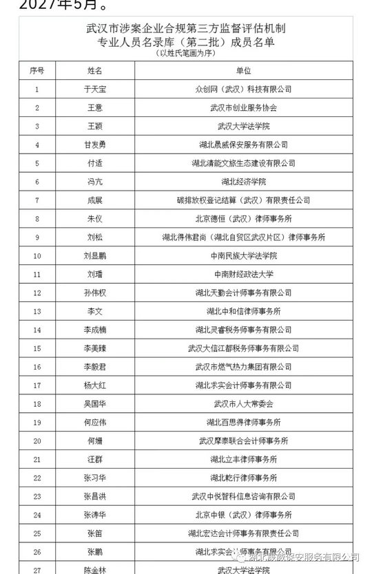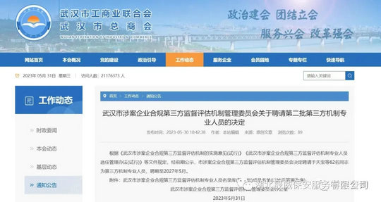 為依法推進(jìn)武漢市企業(yè)合規(guī)檢察改革試點(diǎn)工作,建立健全涉案企業(yè)合規(guī)第三方監(jiān)督評(píng)估機(jī)制,根據(jù)武漢市人民檢察院、武漢市司法局、武漢市財(cái)政局、武漢市人力資源和社會(huì)保障局、武漢市生態(tài)環(huán)境局、武漢市審計(jì)局、武漢市人民政府國有資產(chǎn)監(jiān)督管理委員會(huì)、武漢市市場(chǎng)監(jiān)督管理局(武漢市知識(shí)產(chǎn)權(quán)局)、武漢市地方金融工作局、中國國際貿(mào)易促進(jìn)委員會(huì)武漢市分會(huì)、武漢市工商業(yè)聯(lián)合會(huì)、中華人民共和國武漢海關(guān)緝私局、國家稅務(wù)局武漢市稅務(wù)局等十三部門制定的《關(guān)于建立涉案企業(yè)合規(guī)第三方監(jiān)督評(píng)估機(jī)制的實(shí)施方案(試行)》以及武漢市涉案企業(yè)合規(guī)第三方監(jiān)督評(píng)估機(jī)制管委會(huì)制定的《武漢市涉案企業(yè)合規(guī)第三方監(jiān)督評(píng)估機(jī)制專業(yè)人員選任管理辦法(試行)》等相關(guān)規(guī)定,2023年5月31日,武漢市涉案企業(yè)合規(guī)第三方監(jiān)督評(píng)估機(jī)制管理委員會(huì)公布《關(guān)于聘請(qǐng)第二批第三方機(jī)制專業(yè)人員的決定》聘請(qǐng)62名同志為第三方機(jī)制專業(yè)人員,聘期至2027年5月。